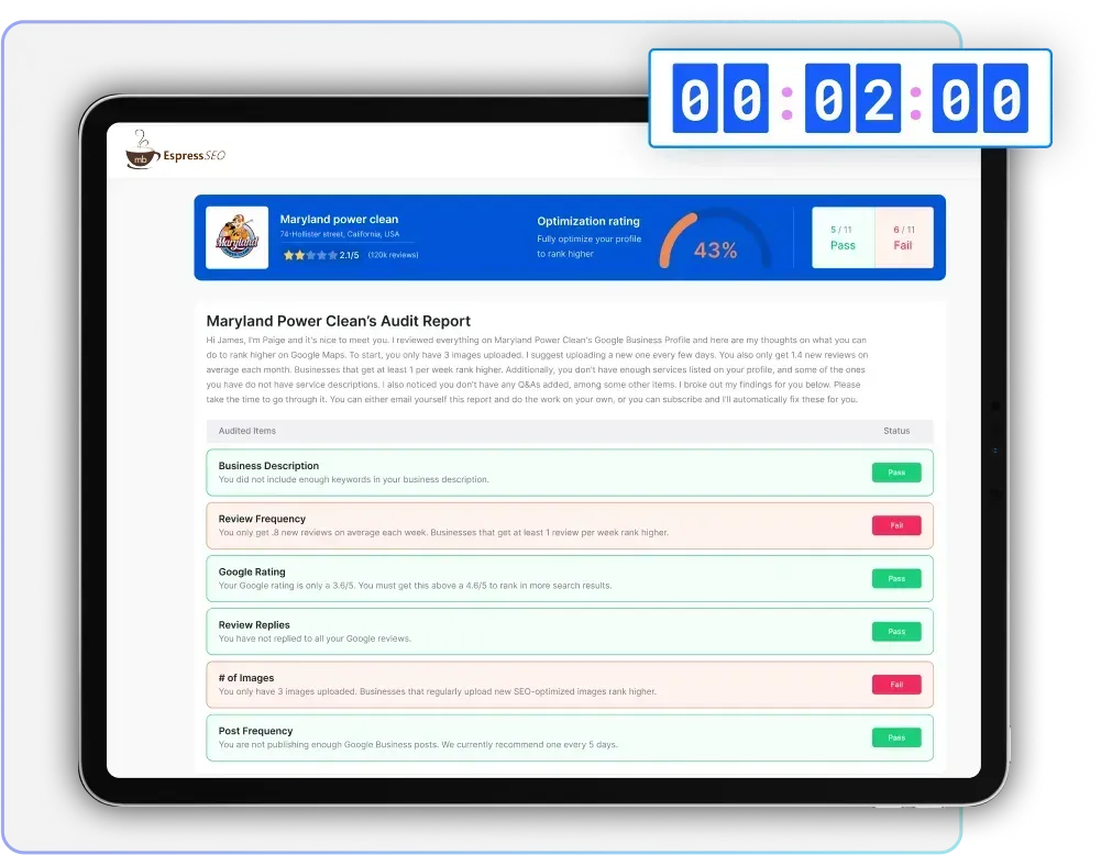 See exactly where your Google Business Profile stands and get a custom plan for dominating local search in your area.